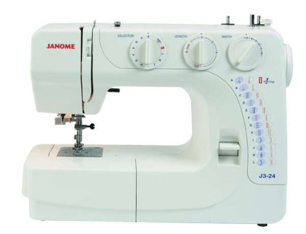 The J3-24 is an excellent machine which is packed with a superb selection of stitches and features. It is a really easy to use three dial model, one for stitch selection one for adjusting stitch length and the other for stitch width adjustment. The automatic 1-step buttonhole produces perfect buttonholes in one easy step whilst the automatic needle threader takes the strain out of threading the needle.